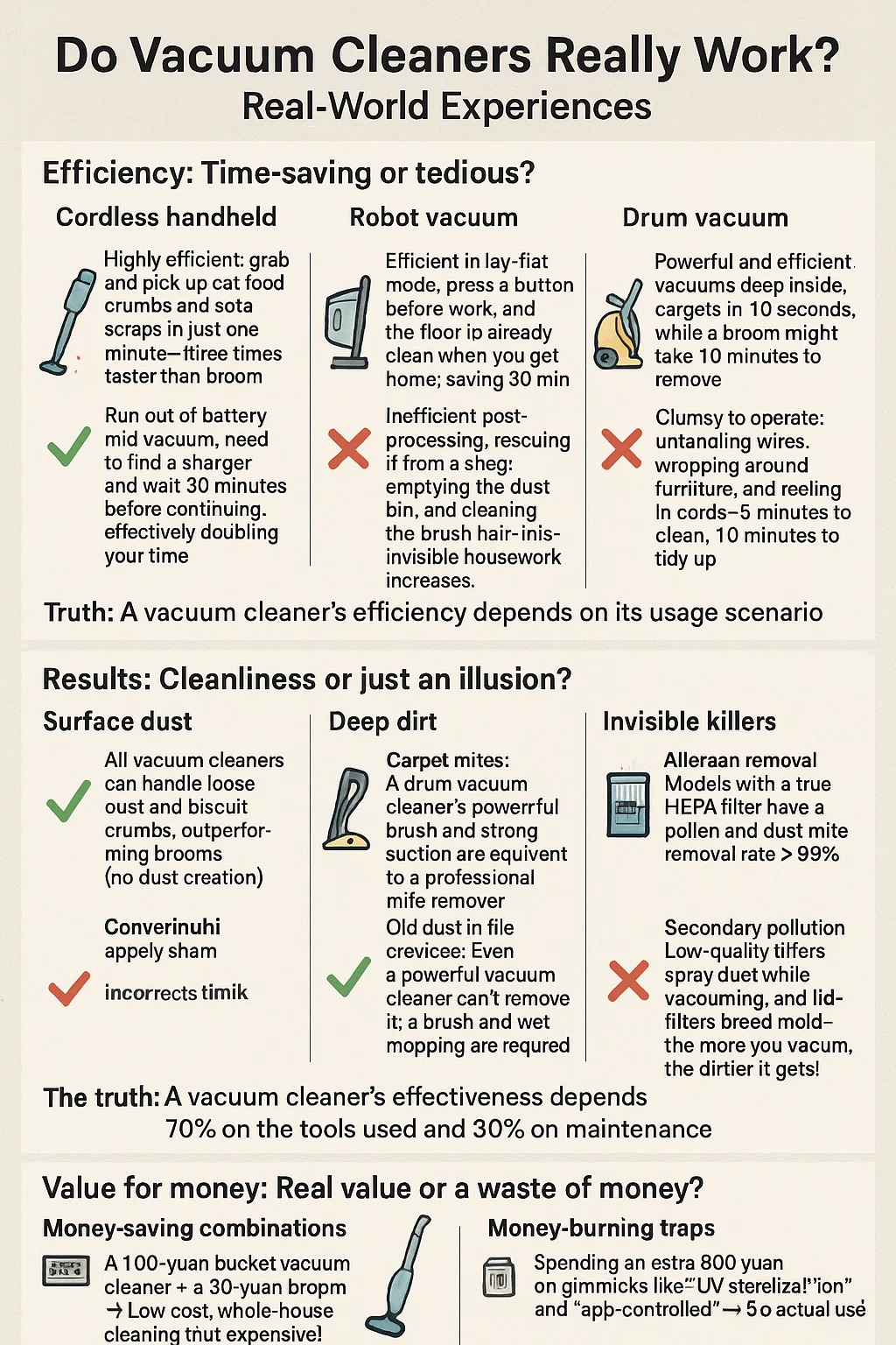 Trommelvakuum: Kraftig og effektiv: Vakuum dypt inne i tepper på 10 sekunder, mens en kost kan ta 10 minutter å fjerne. Klønete å betjene: Untangling ledninger, pakke rundt møbler og rulle i ledninger - 5 minutter å rengjøre, 10 minutter å rydde opp. Sannheten: En støvsugeres effektivitet avhenger av bruken av bruken.
